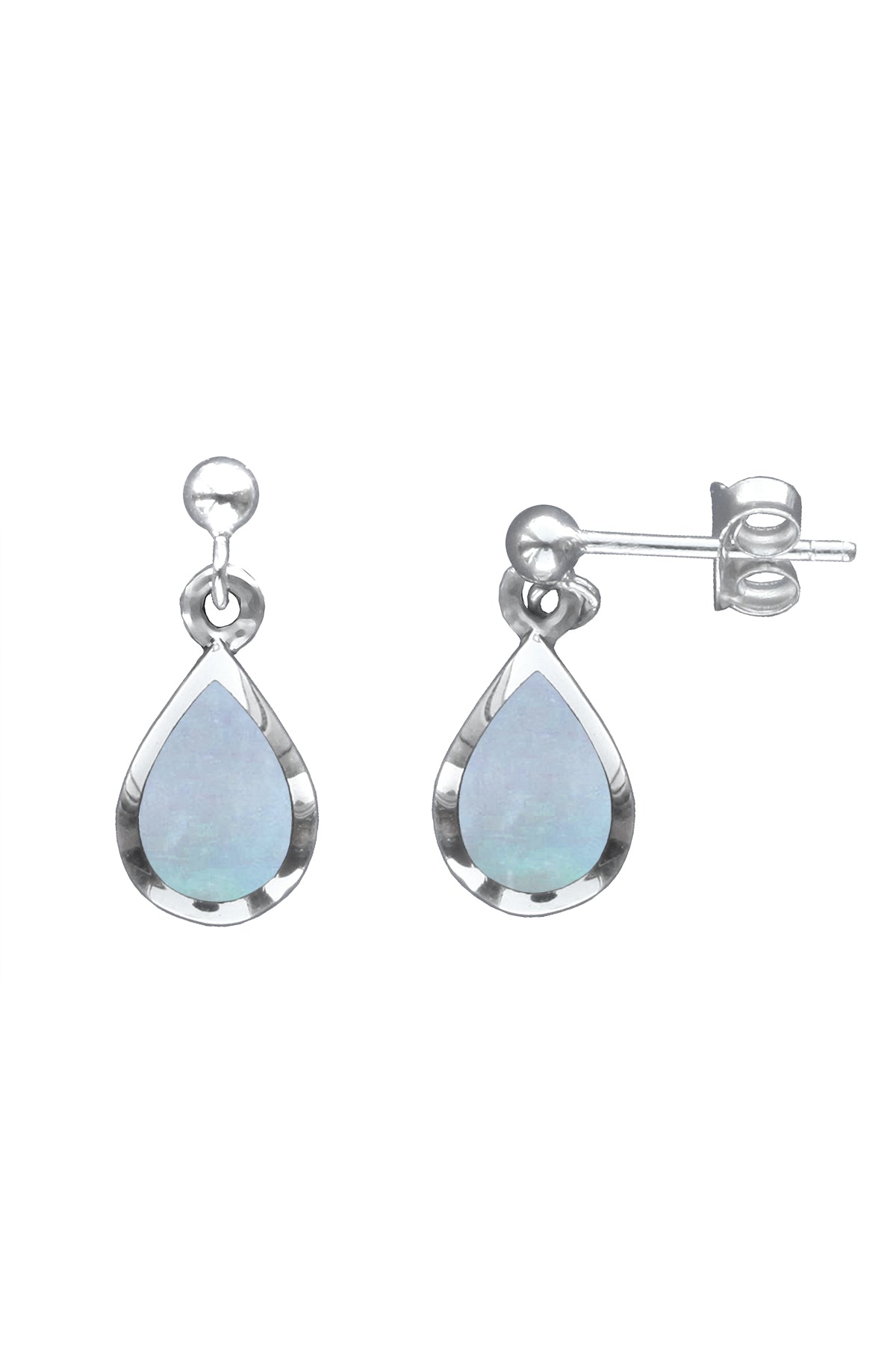 Silver Raindrop Earrings, set with iridescent light blue shell.